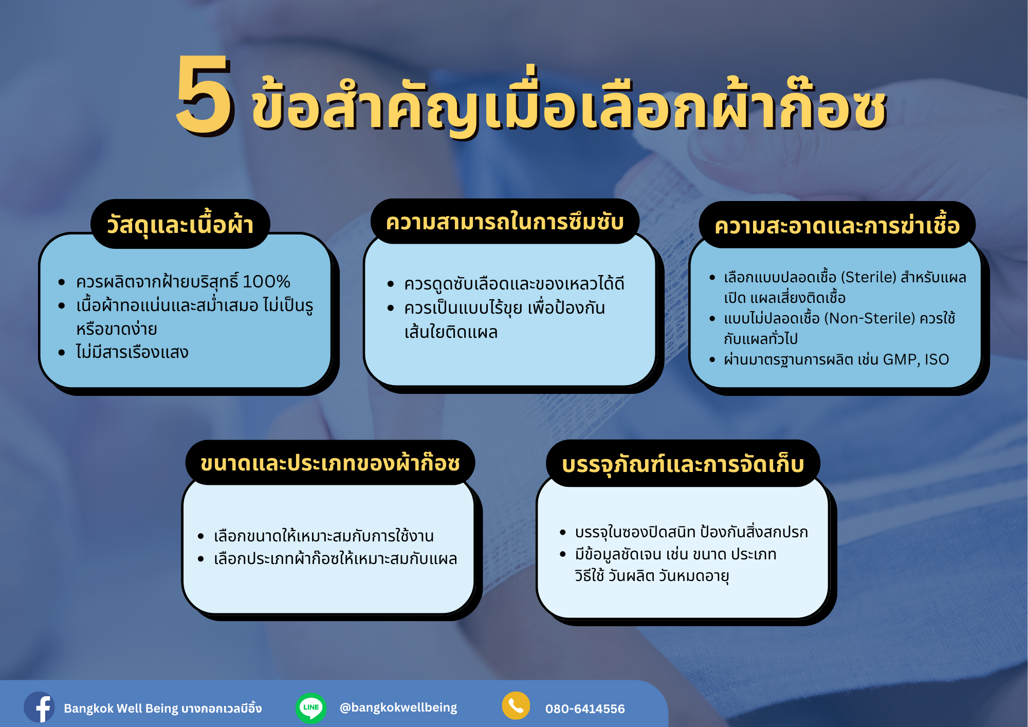 ดังนั้นการเลือกซื้อผ้าก๊อซเพื่อนำมาใช้ในการทำแผลถือเป็นเรื่องที่ควรให้ความสำคัญเป็นอย่างยิ่ง เพื่อให้แผลได้รับการดูแลอย่างมีประสิทธิภาพ และลดความเสี่ยงต่อการติดเชื้อหรือเกิดภาวะแทรกซ้อนอื่น ๆ ตามมาได้ หากต้องการเลือกซื้อ ควรซื้อจากร้านขายอุปกรณ์ทางการแพทย์ที่เชื่อถือได้ เพื่อความปลอดภัยและคุณภาพที่ดีอย่างเช่น ร้านบางกอกเวลบีอิ้งค่ะ
