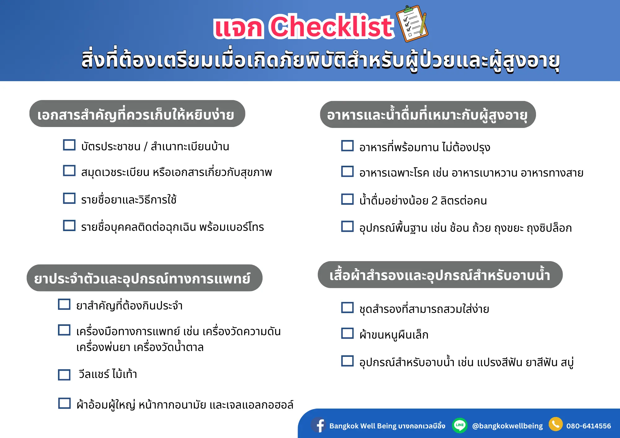 หากคุณยังไม่มีอุปกรณ์ที่ใช้ในยามฉุกเฉิน หรือไม่แน่ใจว่าควรเริ่มจากอะไร ทางร้านเรามี อุปกรณ์การแพทย์สำหรับดูแลผู้สูงอายุและผู้ป่วย ผ้าอ้อมผู้ใหญ่ หรือชุดทำแผลปลอดเชื้อใช้ในยามฉุกเฉิน ที่คัดสรรมาแล้วว่าครบครัน ใช้งานง่าย และเหมาะกับสถานการณ์ต่าง ๆ สามารถสอบถามรายละเอียดหรือสั่งซื้อได้ผ่าน Line Official: @bangkokwellbeing หรือแวะชมได้ที่หน้าเว็บไซต์ของเราได้เลยนะคะ